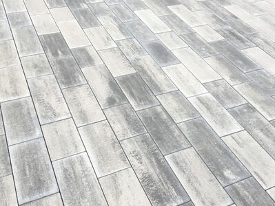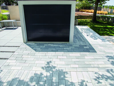 Elegantes Pflastersteinsystem mit drei Formaten in einer Lage. Wasserdurchlässig über die Fuge. Moderne, längschangierende Oberflächen und Farben.
