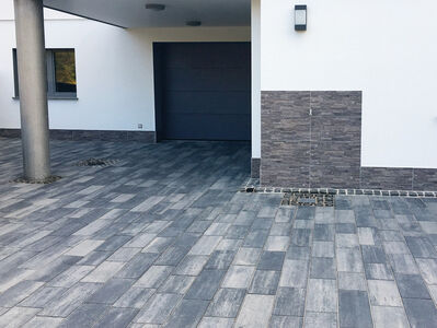 Elegantes Pflastersteinsystem mit drei Formaten in einer Lage. Wasserdurchlässig über die Fuge. Moderne, längschangierende Oberflächen und Farben.